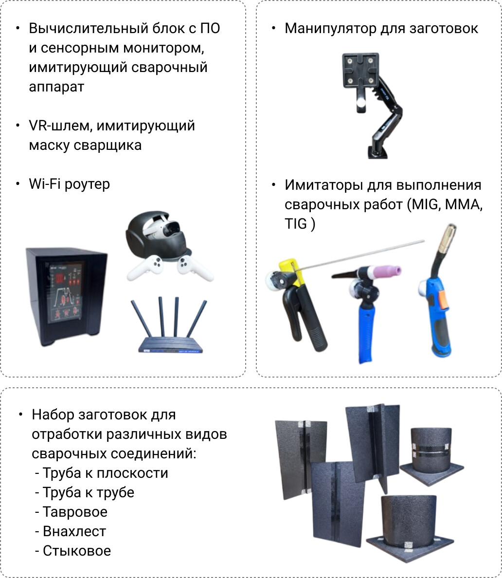 Программно-аппаратный тренажер представляет собой передовую систему для обучения сварочным технологиям. Включает в себя виртуальное моделирование процессов полуавтоматической и ручной сварки в различных режимах и рабочих положениях. Тренажер позволяет отрабатывать ключевые навыки в безопасной и контролируемой виртуальной среде.